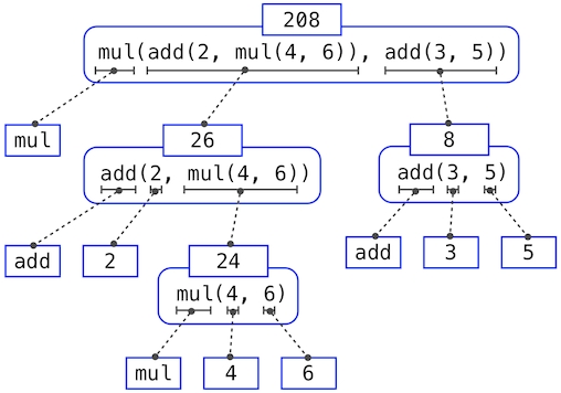 Вычисление call-выражений: 1. Evaluate the operator and operand subexpressions, then 2. Apply the function that is the value of the operator subexpression to the arguments that are the values of the operand subexpressions.
